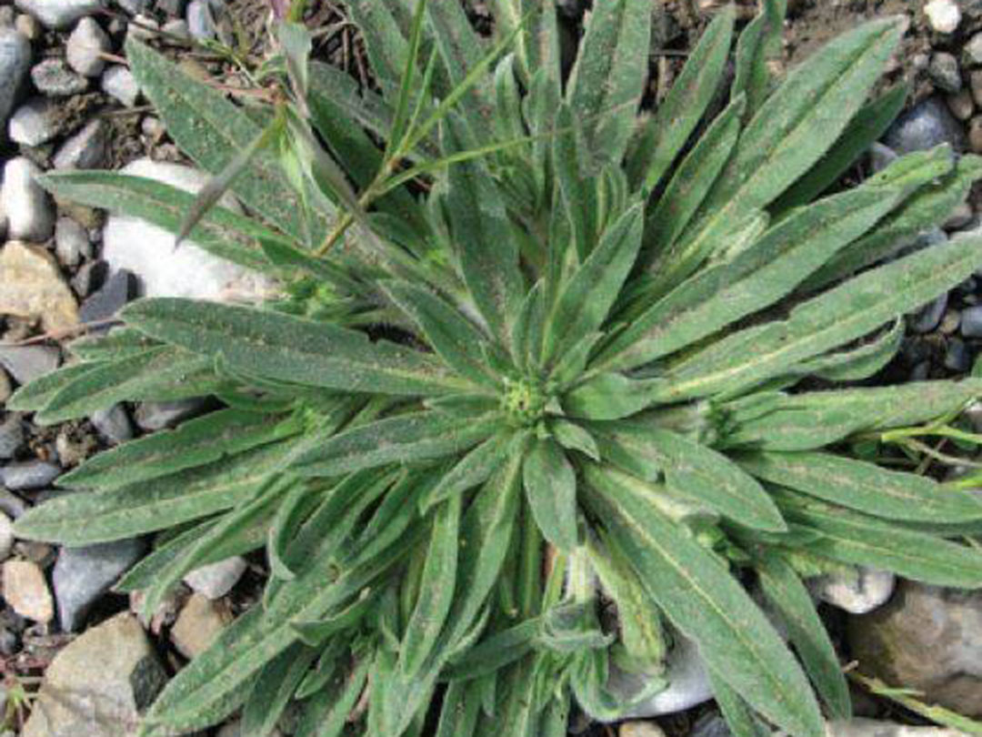 Leaves: Lance-shaped, rough, and hairy leaves, particularly noticeable at the plant's base.