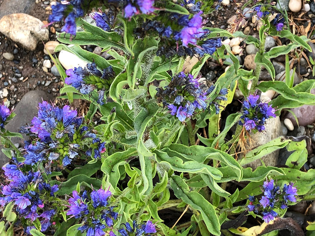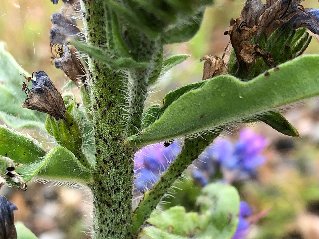 Growth Habit: Biennial or perennial herb that can reach heights of up to 1 meter. In its first year, it forms a basal rosette of rough, hairy leaves, and in its second year, it sends up a tall, branching flower spike covered in bristly hairs. In situ, blueweed often forms dense colonies of tall, spiky plants with striking blue flowers.