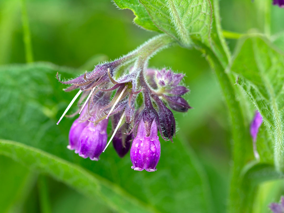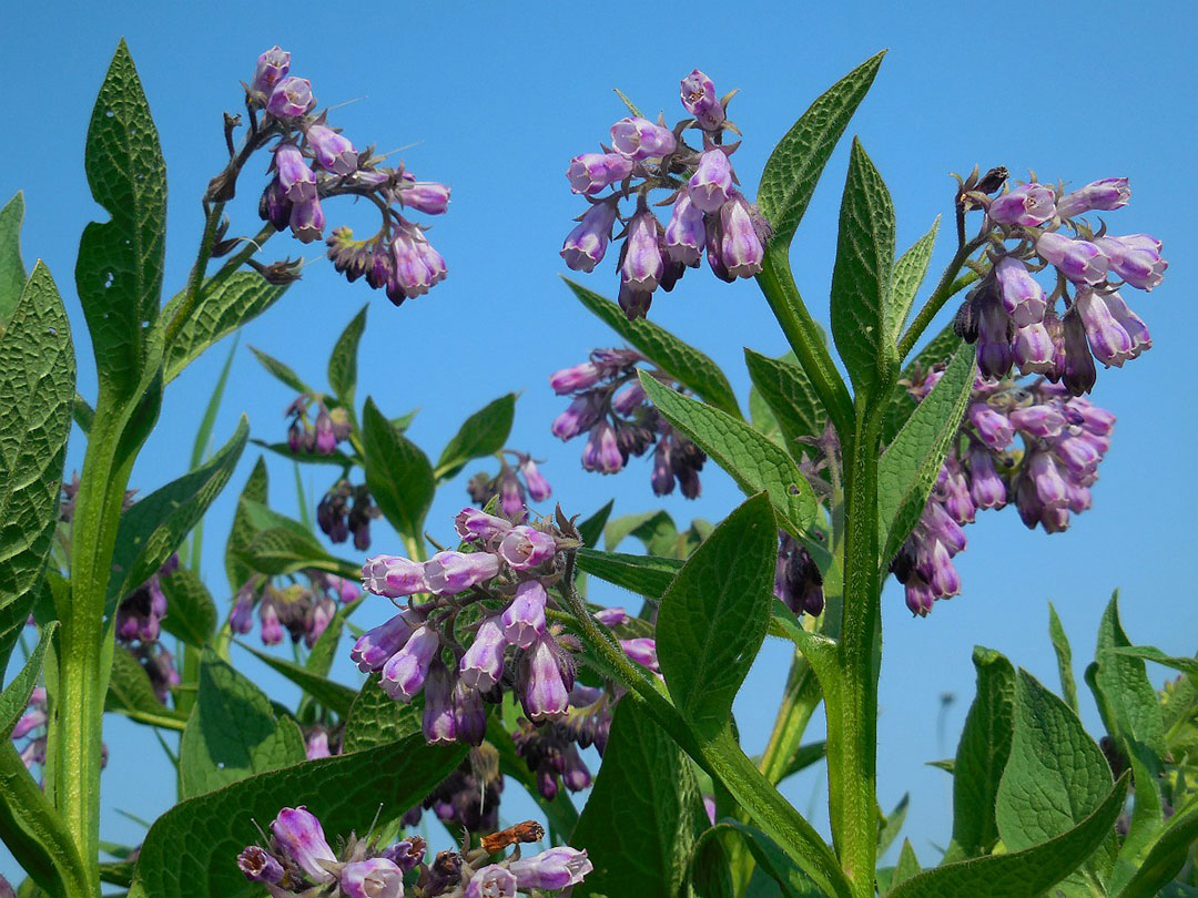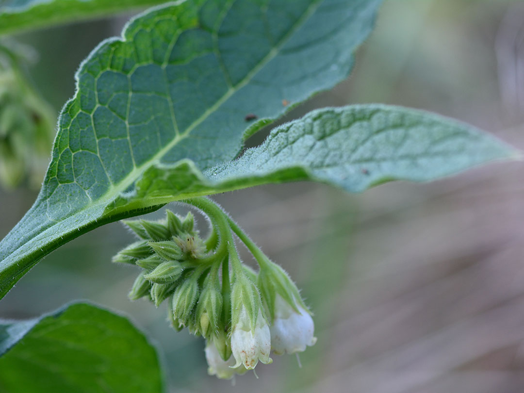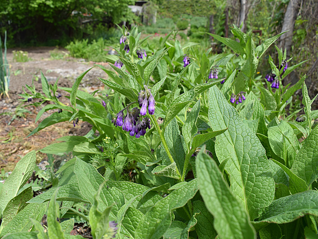 Growth Habit: A perennial herb that grows from a deep taproot, forming dense clumps of large, rough (hairy) leaves. It spreads through rhizomes and can form large colonies. In situ, common comfrey often creates a dense, leafy mass in moist areas, with clusters of bell-shaped flowers on tall stalks.