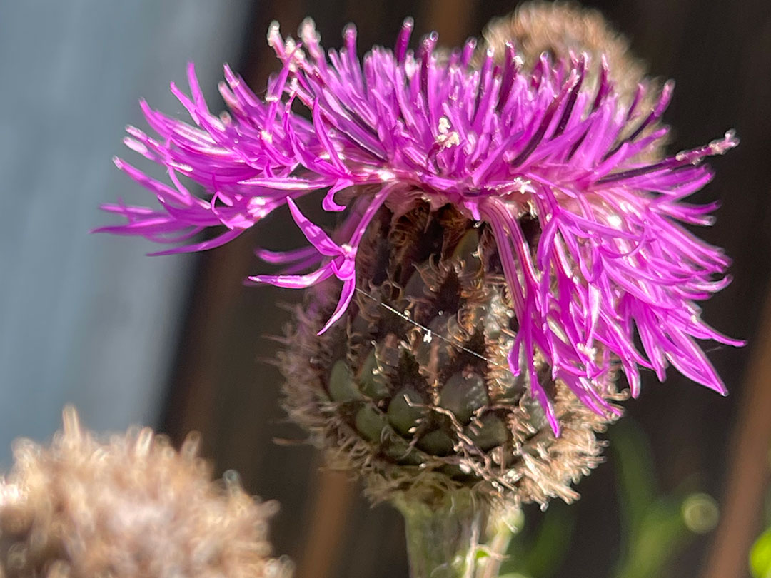 Flower: Large, bright purple, thistle-like flower heads that bloom from midsummer to fall.