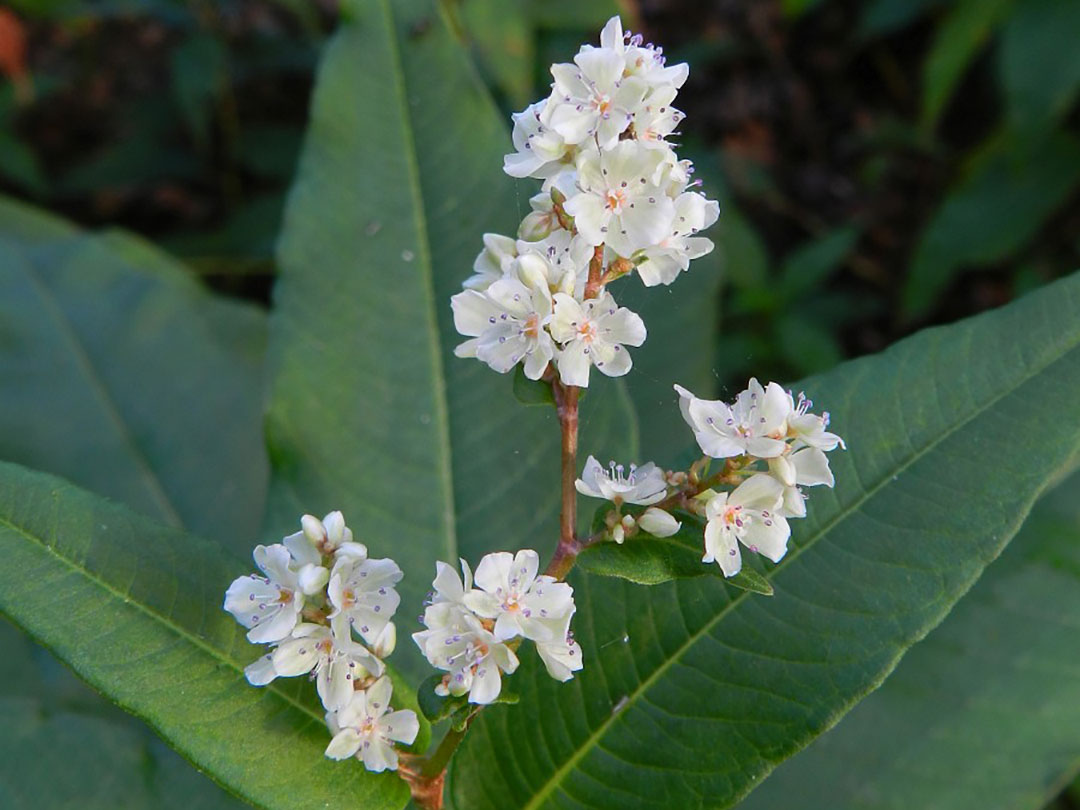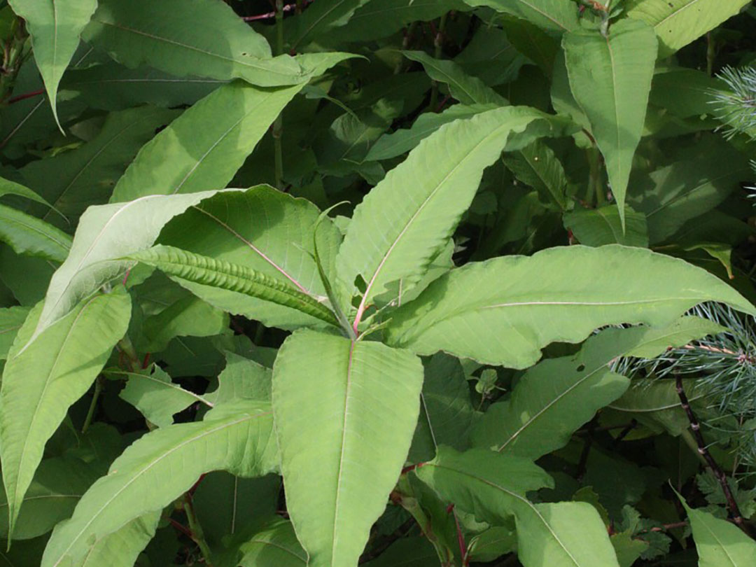 Leaves: Long, lance-shaped to narrowly heart-shaped, with smooth edges and a pointed tip. The leaves are lighter green compared to other knotweed species and can grow up to 20 cm long. They are arranged alternately along the stem, but unlike other knotweeds, the branches do not exhibit a pronounced zigzag pattern.