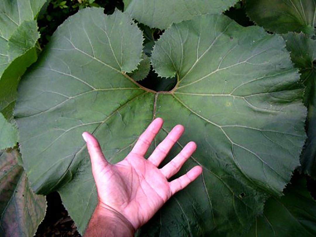 Leaves: Enormous, round, and deeply lobed leaves, often exceeding 1 meter in diameter.